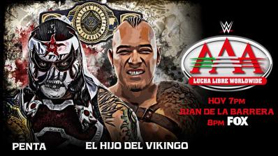 Penta se dispone a aplicar un Mexican Destroyer, pero El Hijo del Vikingo lo revierte en un Spanish Fly. El Hijo del Vikingo busca altura para rematarlo con un diving footstomp. 1..2..NO. La acción se traslada al apron. Ambos hombres intercambian chops. El Hijo del Vikingo patea la cara del campeón. Este responde con una superkick antes de cargar con su oponente sobre sus hombros. Sin embargo, ¡El Hijo del Vikingo lo sorprende con una poisonrana! Penta acaba en el suelo de ringside. Los fans abuchean al retador.