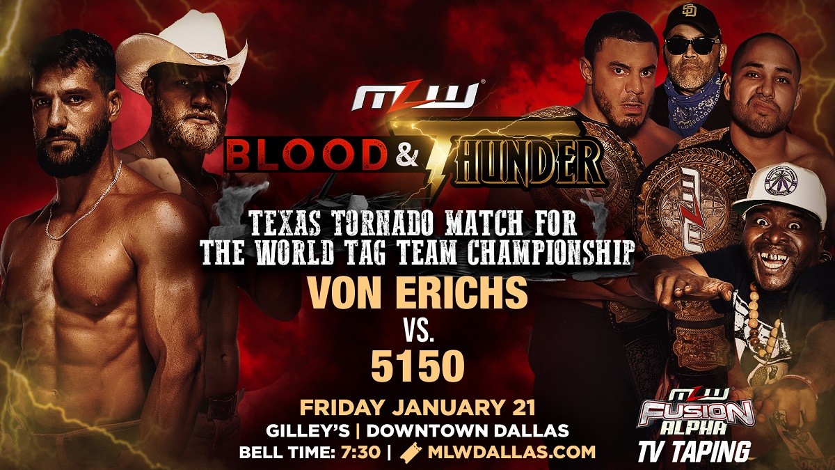 Novedades para MLW Blood & Thunder. Tal y como confirmó hace unos días Major League Wrestling, en un comunicado de prensa en su página web oficial, 5150 (Danny 'Limelight' Rivera & Slice Boogie) defenderán los campeonatos por parejas de MLW ante los hermanos Von Erich.