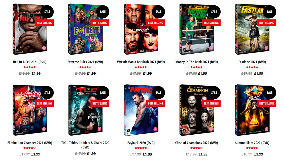 En esta sección encontrarás auténticas ganas para coleccionista, desde shows de PPV celebrados en el año 2021 a 1,99 libras, hasta eventos de otros años en formato Blu-Ray a partir de 2,99 libras. WWE DVD UK también ofrece algunos packs especiales por un precio un poco más elevado (5,99 libras). Algunos ejemplos de esos packs son "WWE The Rock – The Most Electrifying Man In Sports Entertainment", Undertaker – The Last Ride o algunas ediciones starndart de WrestleMania.