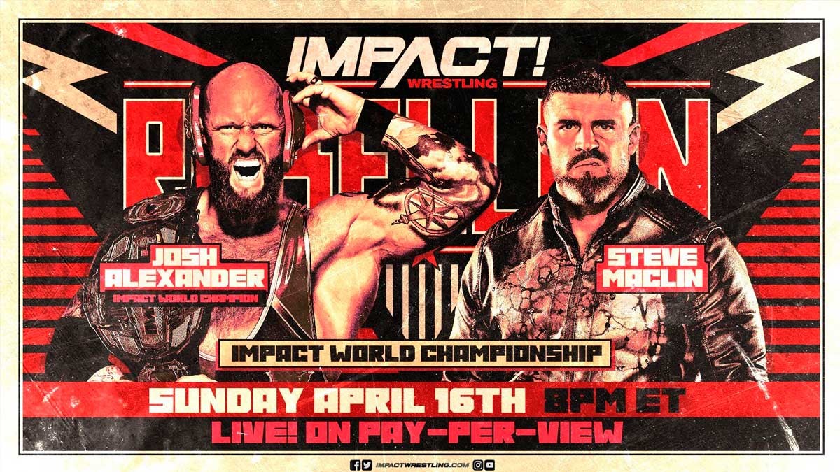 Durante la emisión del último evento de PPV No Surrender, Steve Maclin venció a Brian Myers, PCO y Heath en un combate a cuarto bandas para convertirse en el aspirante número uno al Campeonato Mundial de IMPACT. En ese momento, no se anunció la fecha del combate entre Maclin y Joshn Alexander, pero Impact Wrestling ha confirmado que la lucha finalmente tendrá lugar en Rebellion.