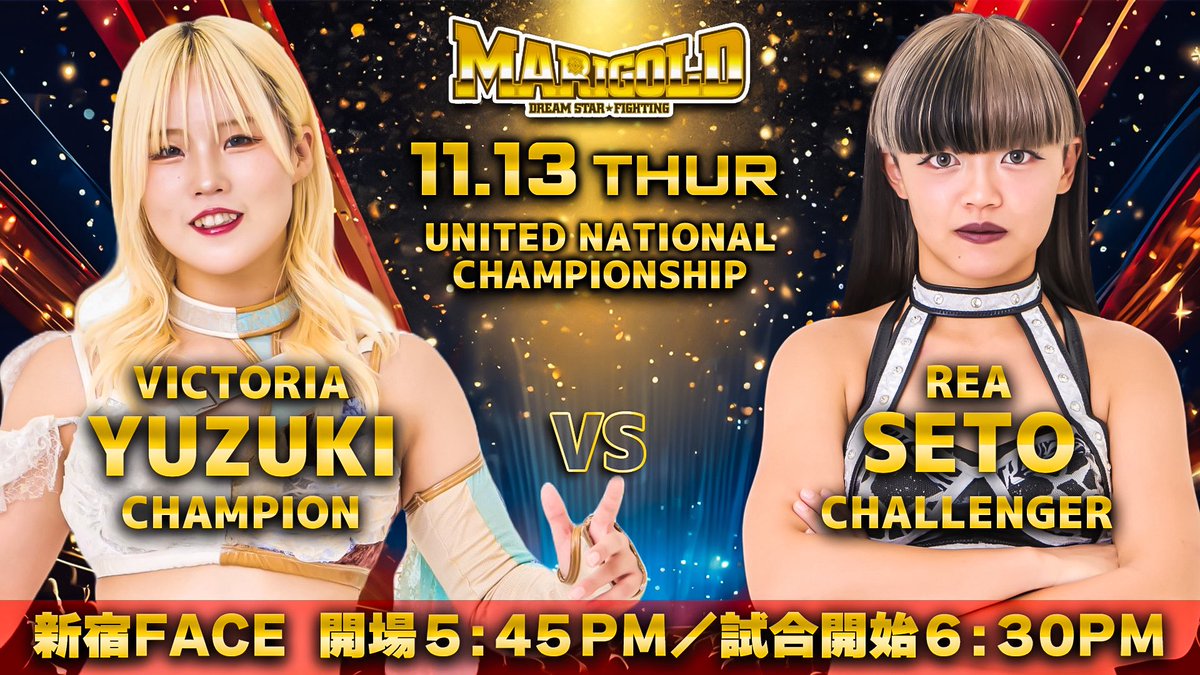 - Victoria Yuzuki venció a Rea Seto para retener el Campeonato Nacional Unificado de MARIGOLD en el evento estelar. Yuzuki aplicó un Victory Sunset para la victoria, firmando así su primera defensa titular.