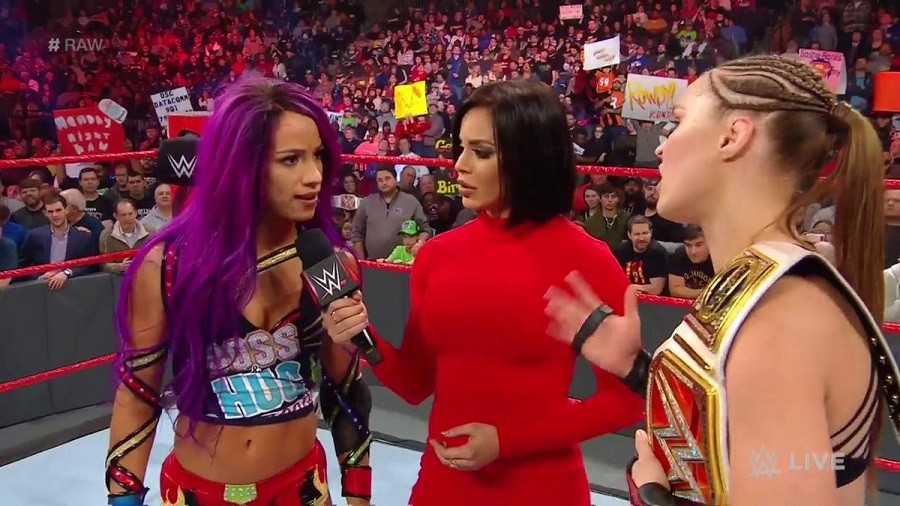 En el reciente programa de Monday Night Raw, la campeona femenina de la marca roja Ronda Rousey y Sasha Banks vencieron al dúo conformado por Nia Jax y Tamina. Tras el combate, The Boss y Rowdy intercambiaron palabras en torno al combate que tendrán ambas en el evento Royal Rumble, donde el Campeonato femenino estará en juego.