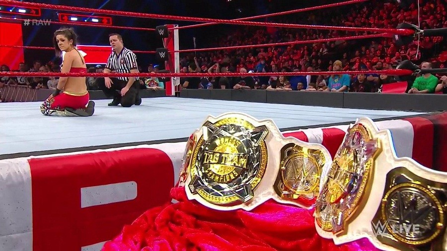 En el reciente programa semanal de Monday Night Raw, se celebró un combate entre tres de los seis equipos que conformaran el combate por los Campeonatos femeninos en el evento Elimination Chamber. Nia Jax y Tamina vs. Sasha Banks y Bayley vs. The Riott Squad se enfrentaron y el equipo perdedor saldría de primero en la Elimination Chamber Match, siendo Banks y Bayley las que perdieron.