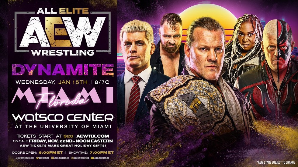 All Elite Wrestling anunció anoche que el episodio de AEW Dynamite que se emitirá el 15 de enero de 2020 se celebrará en el Watsco Center de Miami, Florida, un pabellón que tiene una capacidad de 8.000 personas y que forma parte del campus de la Universidad de Miami. Será la primera vez que la empresa celebre un show en la ciudad y se llevará a cabo unos días antes del Chris Jericho's Rock 'N' Wrestling Rager at Sea: Part Deux, el cual se celebrará en un barco que zarpará de Miami en dirección a Bahamas y que tendrá una dirección de 5 días.