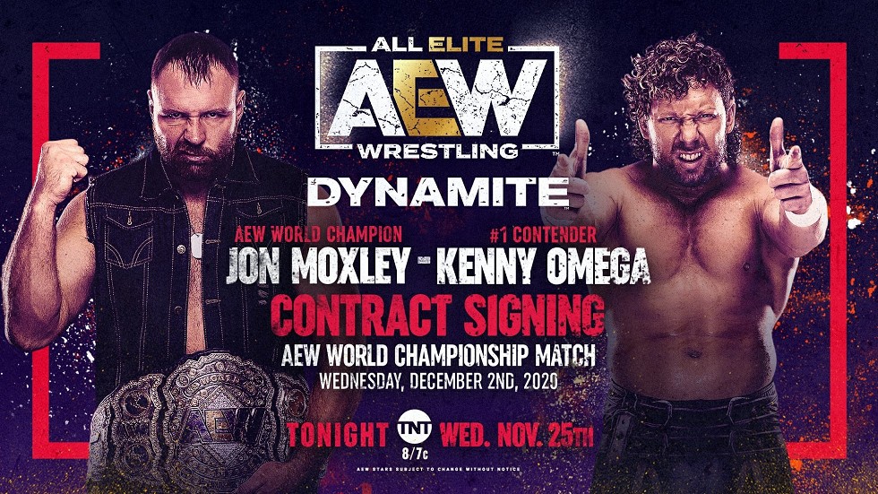 All Elite Wrestling ha anunciado que esta noche, en AEW Dynamite, Jon Moxley y Kenny Omega firmarán el contrato que les permitirá competir por el Campeonato mundial el 2 de diciembre. Será el segundo intenta de firma, dado que la semana pasada ambos fueron programados, pero Moxley fue atacado entre bastidores.